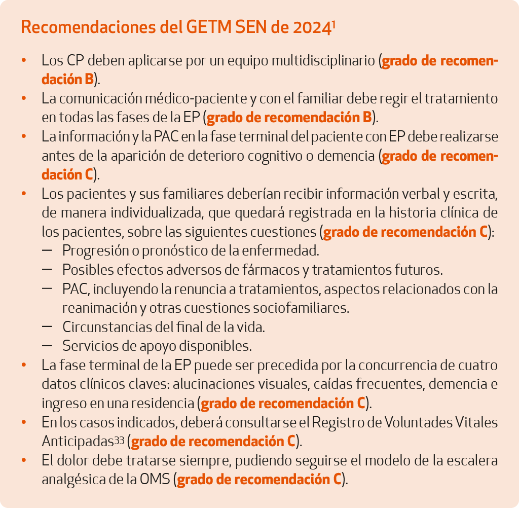 Aunque puedan aplicarse CP en las distintas fases de la EP, los CP protagonizan la etapa de la EP avanzada (EPA) con síntomas refractarios a tratamiento, habitualmente demencia con/sin comorbilidades graves, es decir, pacientes sin autonomía6.