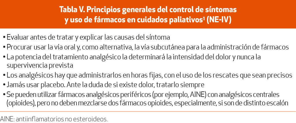 Se deberá tratar el dolor independientemente de la causa, y es necesario identificar el tipo (agudo o crónico, nociceptivo o neuropático) y evaluar su intensidad mediante escalas sencillas como la escala visual analógica (EVA). Además de considerar medidas físicas, hay que elegir el tratamiento farmacológico más idóneo siguiendo la escalera analgésica de la OMS23 (NE-IV) según su intensidad: