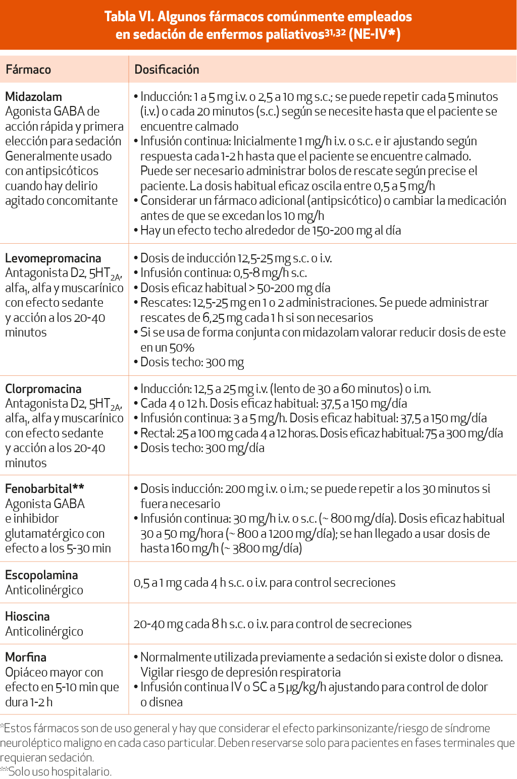 Los fármacos necesarios para un adecuado control de síntomas, así como las medidas de prevención para evitar complicaciones en la fase de agonía, deben mantenerse hasta el final, simplificando al máximo el tratamiento como se ha referido. Son de elección (Tabla VI), por este orden, las benzodiacepinas (midazolam), los neurolépticos sedativos (clorpromazina o levomepromazina), los anticonvulsivos (fenobarbital) y los anestésicos (propofol). El midazolam es siempre la primera opción, excepto si el síntoma refractario es el delirio, siendo en este caso de elección la levomepromazina. La vía de administración de elección es la subcutánea, sobre todo si la venosa no es fácilmente canalizable o si el paciente se encuentra en el domicilio. Puede ser necesaria la administración de otros fármacos: anticolinérgicos (como antisecretores bronquiales) y los opioides, que no deben ser retirados durante la sedación, aunque puede reducirse su dosis1,29 (NE-IV).