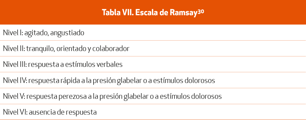 Como con cualquier otro tratamiento, se debe realizar una evaluación continua del nivel de sedación en el que se encuentra y necesita el paciente. Se recomienda para este fin la escala de Ramsay30 (Tabla VII). En la historia clínica y en las hojas de evolución, deberán registrarse con el detalle necesario los datos relativos al ajuste de las dosis de los fármacos utilizados, a la evolución clínica de la sedación en la agonía y a los cuidados básicos administrados29.